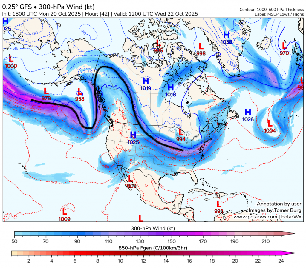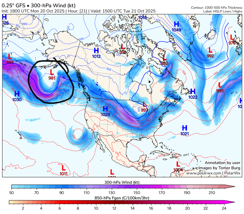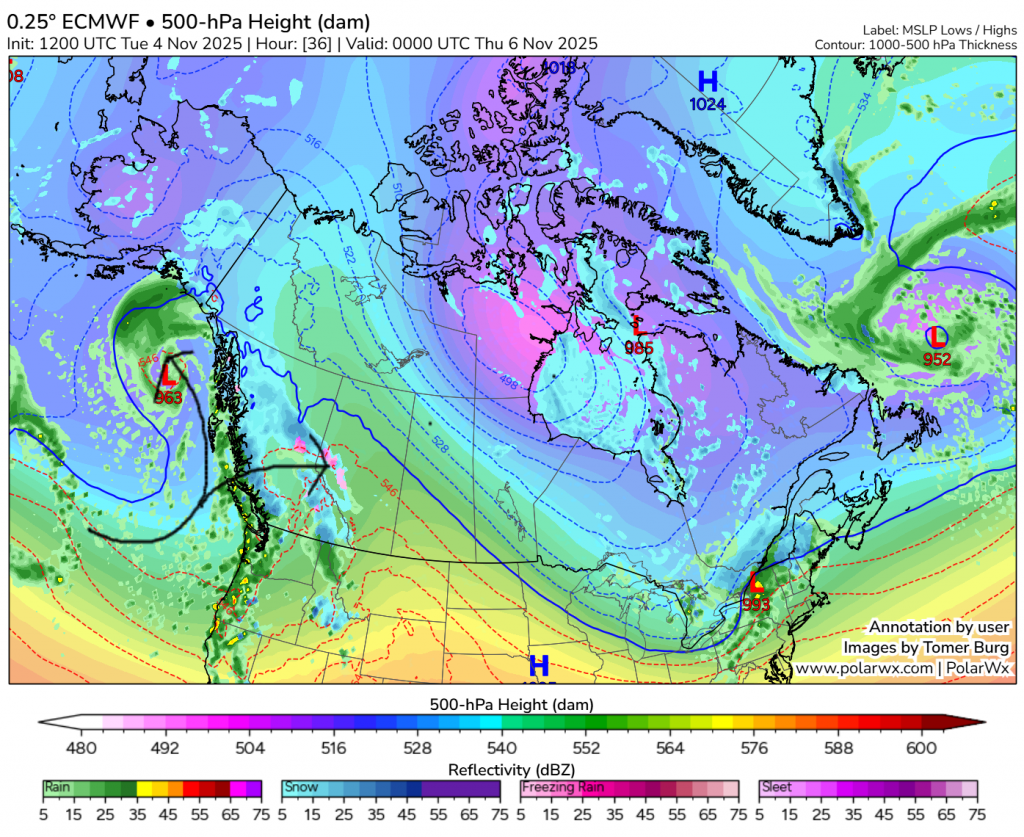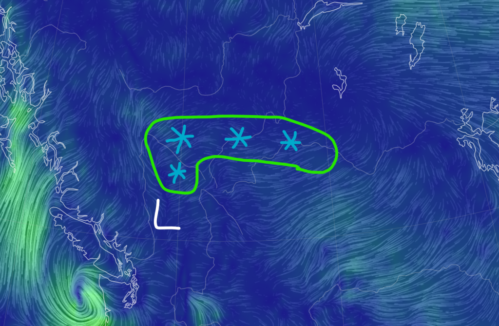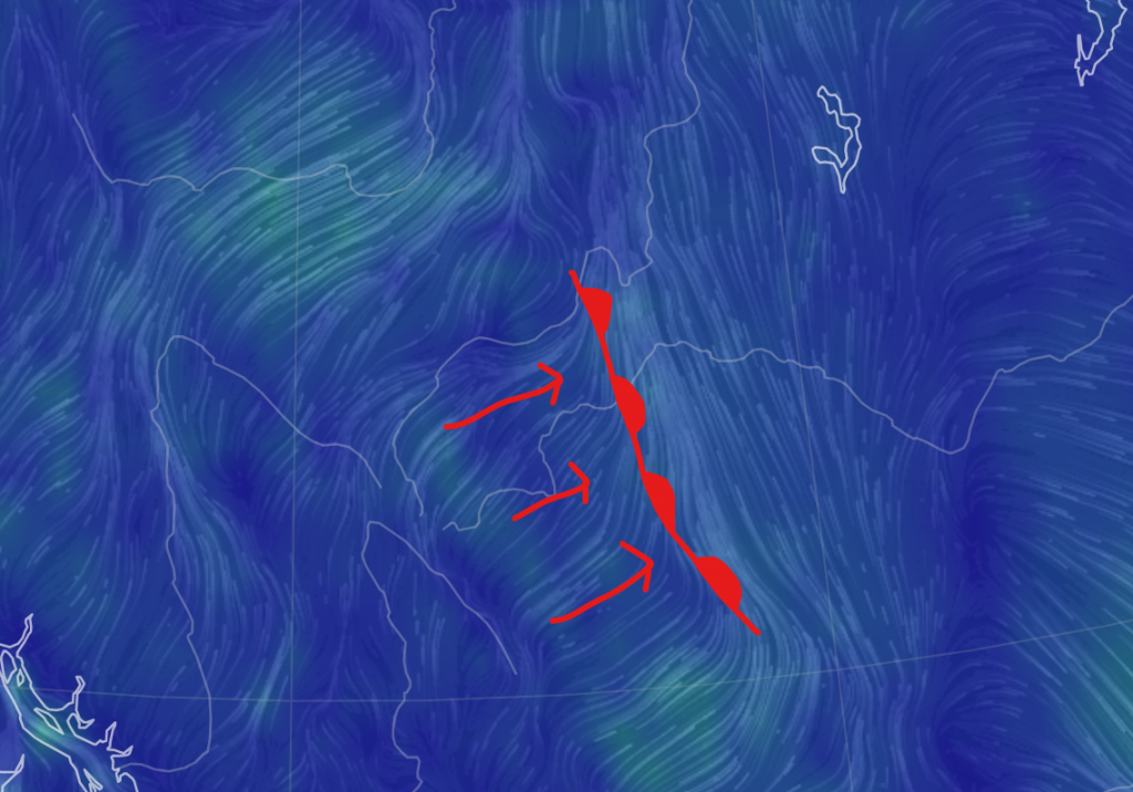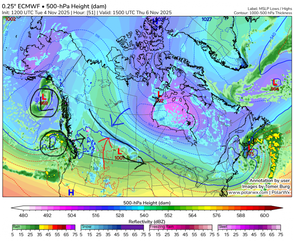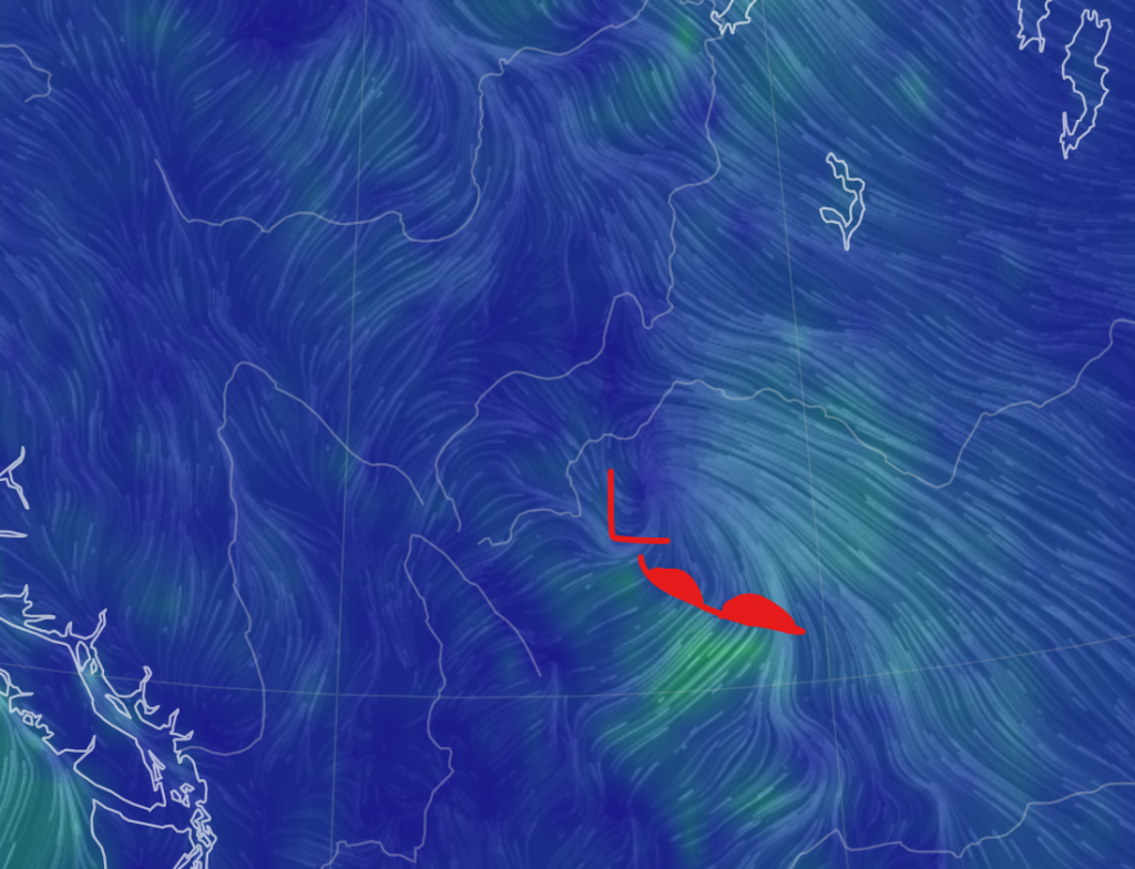 Now for the forecast. To begin, we will have to look at the low in the bottom left of the right image; the one around the coast. A shortwave trough is going to develop on the coast of the US from this low, and will quickly overpower it, turning into a deep system. It will continue to run up the coast, but once it hits Canada near midnight tonight it will split: A weaker trough off the southern BC coast, and a stronger one in the SE corner of BC.