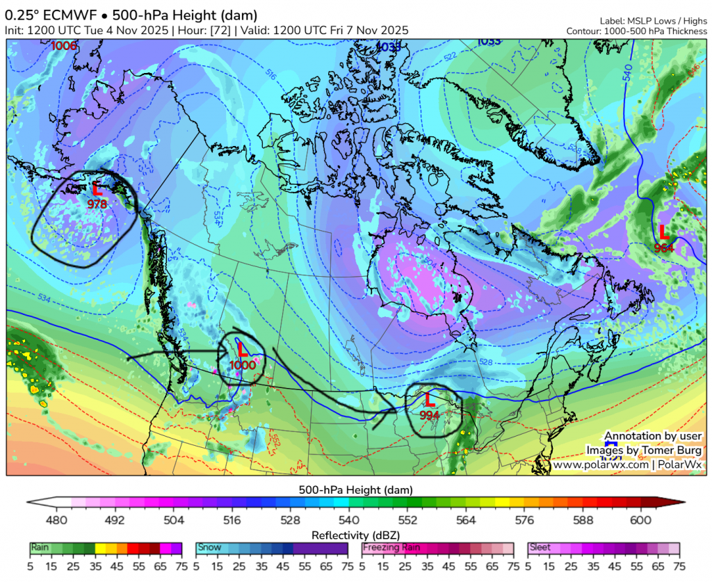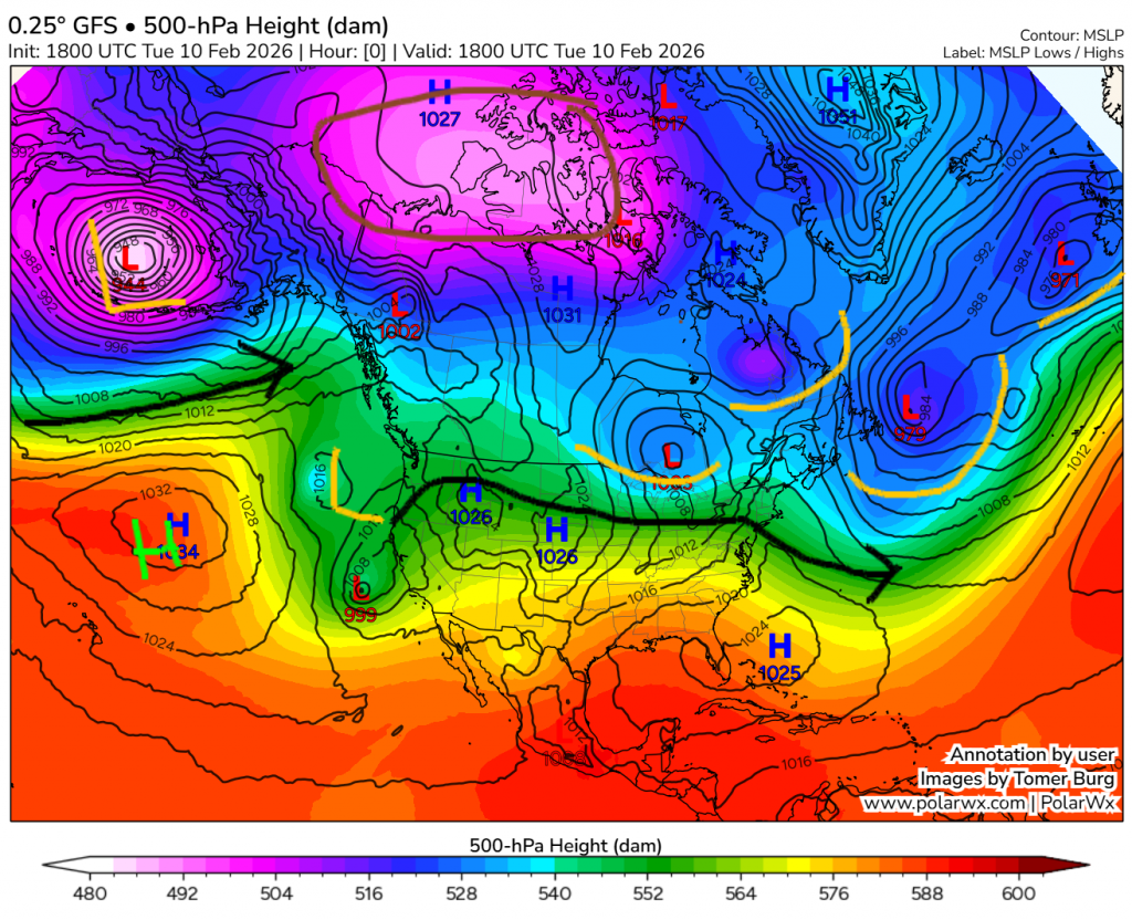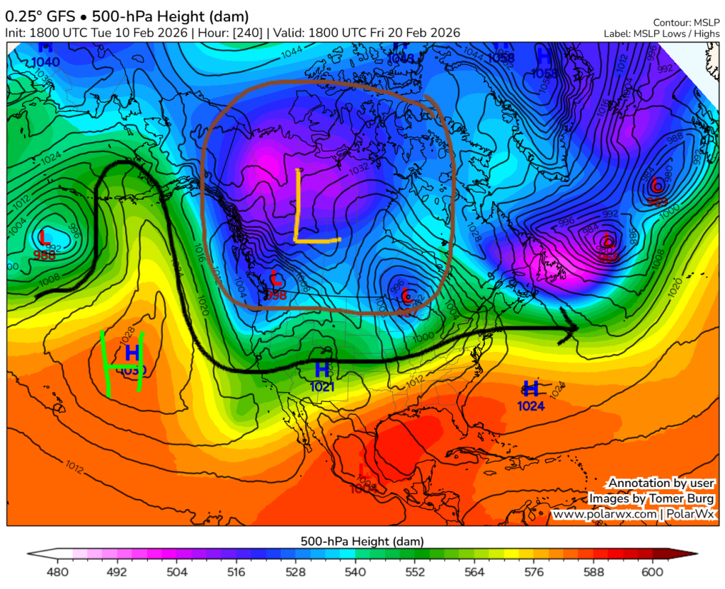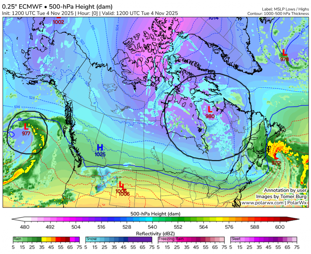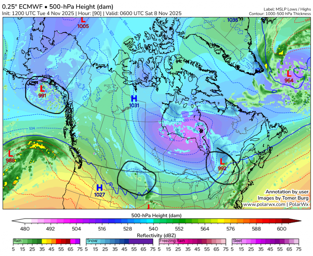 On the left map, we can see the overall flow at 500 hPa. We still have our now multi-week triple upper-low system over Canada, with an anchoring low in Nunavut, and two digging lows over the BC coast and the Maritimes. We also have upper ridging over the Bering Sea, the Prairies, and the eastern Atlantic. The yellow line is where the polar vortex is, and the yellow L is the stratospheric low anchoring it. The most below average temperatures are along the yellow line.