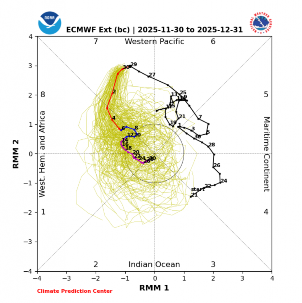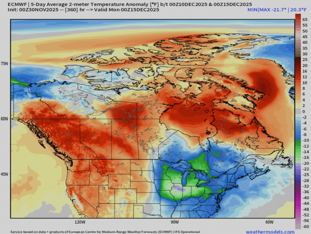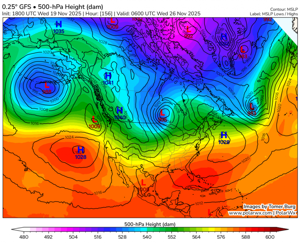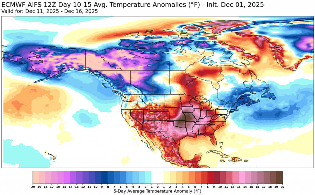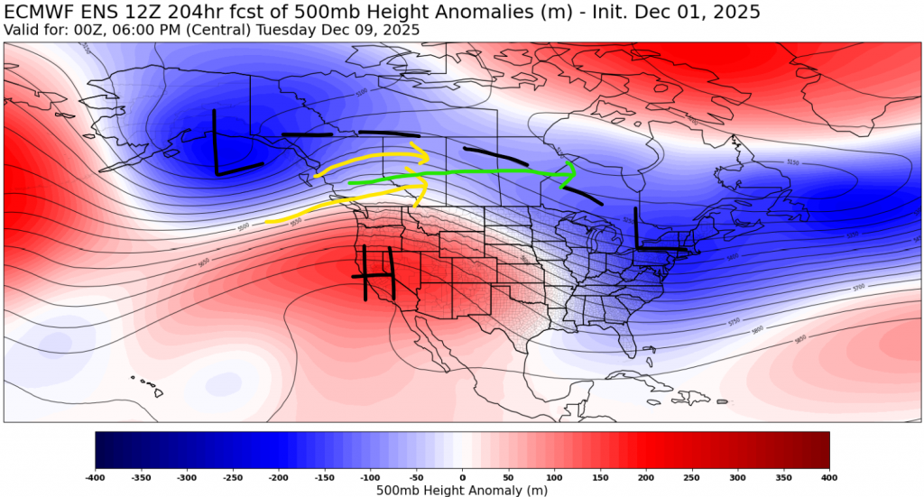 On the left map, we can see the overall flow at 500 hPa. We still have our now multi-week triple upper-low system over Canada, with an anchoring low in Nunavut, and two digging lows over the BC coast and the Maritimes. We also have upper ridging over the Bering Sea, the Prairies, and the eastern Atlantic. The yellow line is where the polar vortex is, and the yellow L is the stratospheric low anchoring it. The most below average temperatures are along the yellow line.