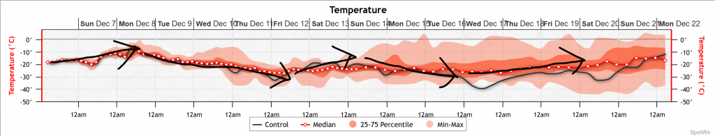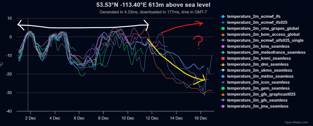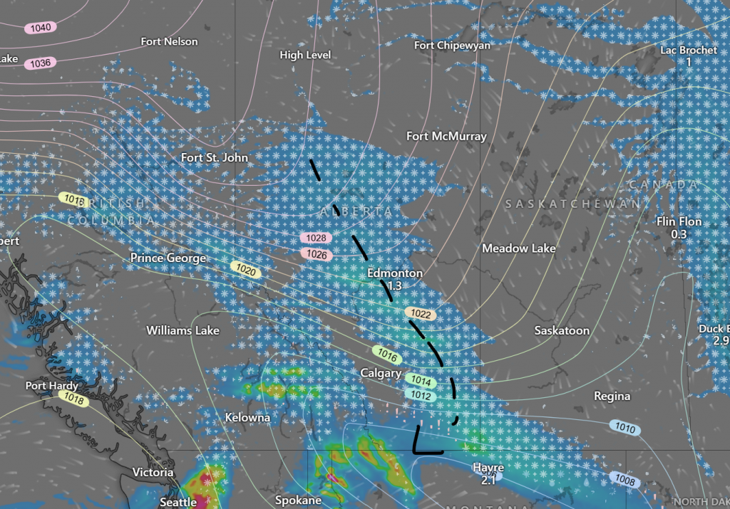 This snow that comes through will be very heavy, and will accumulate quite a blanket. As your actual forecast, expect snow to start sometime in the morning (between sunrise and noon), and end sometime in the evening. Accumulations are 10-20 cm for central Alberta (enough for a special weather statement to be issued yesterday), with the best chances at yellow snowfall warnings being situated in the Edmonton and Lloydminster areas.