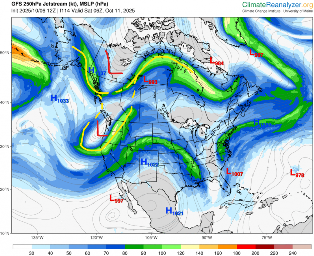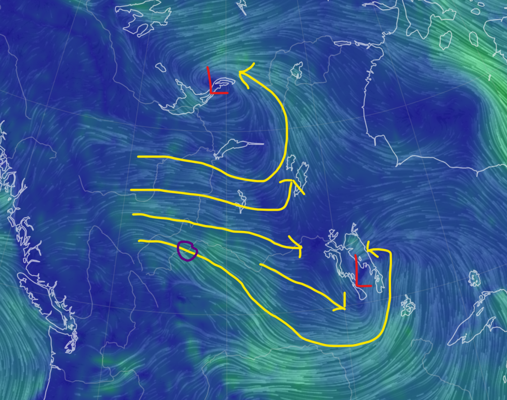 Currently, what are the models actually saying the reason for this long-awaiting cooldown is? I’ve looked, and it seems to be one thing: The Pacific High. for quite a while the Pacific high has been far out west. Usually it’s only 1-2 thousand kilometres off the west coast of the US, but for a while now it’s been more 3-4. It seems later this week it may actually drift back to its normal position, which when paired with the low in the Gulf of Alaska will really speed up the jet stream, pushing out the block. The low then sends out a trough, and down the temperature goes.
