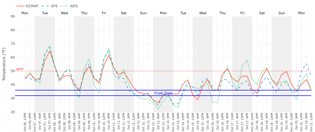 As you have seen if you’re checking your inbox (or your junk file for my grandma for some reason) lately, the next few days are slightly above average, then down to slightly below on the weekend. For the most part dry, maybe a shower here or there. Since it is October, we do have to talk about frost. Our first frost was actually technically last Thursday morning. I woke up to the lightest coating on the rooftops, but not even anything on the ground. For our first significant frost, we’re still waiting. There is a chance these next for nights, maybe ~20% each, but nothing saying a definite frost until Saturday night. So our first significant frost is probably at the latest Monday morning. I say that because we might actually end up pretty windy for Saturday night, which could significantly reduce the amount of frost that forms.